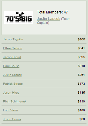 As of this writing, we have raised $3,922. The goal is $5,000. I’m not above wearing a speedo to raise some doll hairs, but only if we eclipse the 5k mark. Here is what a few of us are doing. If anybody else wants to get in on the donation festivities, put it in the comments. Here are the top raisers in the team. I’ll remind you that the best raiser not named Jacob will win cash and prizes.