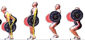 However, instead of doing the full progression, we’re just going to work with the “jumping position”, the jump, and the catch. Sometimes there aren’t bumper plates in a gym. Other gyms have them, but not any that are lighter than 25lbs (for 95 total lbs). The hang power clean will let the girl learn how to do the jump effectively with a weight that is easy to learn with. All she has to do is push her hips back to get to the jumping position, jump, and catch it on the shoulders (see image below). Note that in the “jumping position”, the shoulders are in front of the bar; this is important for stretching the hamstrings and utilizing them effectively in the jump.